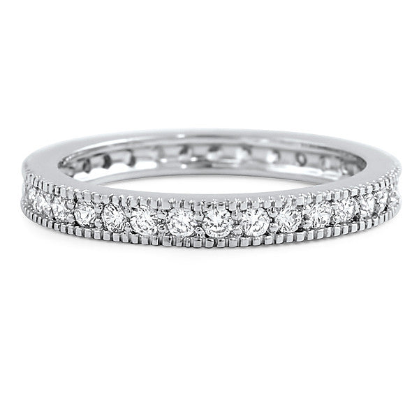 This simple and elegant band features Signity CZ stones throughout with nice texture on the edges. This gorgeous eternity band features Signity CZ stones hand set throughout. This ring is hand crafted out of 925 sterling silver. It has a lustrous rhodium finish that prevents tarnish and gives you the look and feel of white gold jewelry.